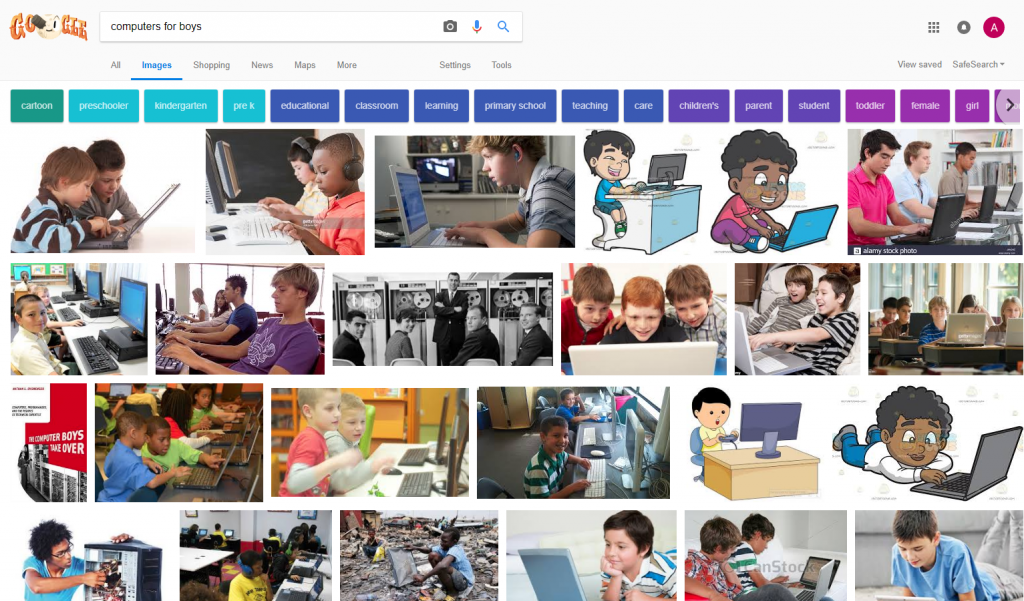 Da die Ergebnisse der Suchmaschine auf den PageRank-AlgorithmusDas bedeutet, dass diese Bilder häufiger auf diese stereotypen rosa Computer verweisen als auf positive Webseiten wie Stemetten, Code First: Mädchen, Mädchen, die coden und viele andere wunderbare Organisationen, die sich für die Gleichstellung im Technologiesektor einsetzen. Das mag zum Teil daran liegen, dass auf diesen Websites nicht viele Bilder zur Verfügung stehen. Wahrscheinlicher ist jedoch, dass es mit den tief verwurzelten Geschlechterstereotypen zu tun hat, die wir heute in der Gesellschaft sehen.